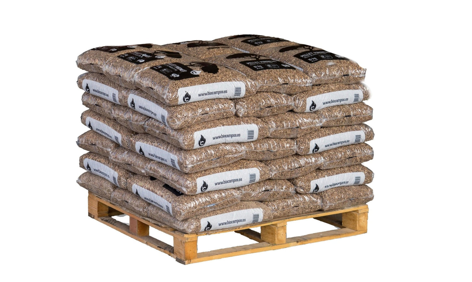 Palé con 42 sacos de pellets de 15 kg cada uno, combustible natural que genera un alto poder calorífico con muy bajos niveles de CO₂, lo que contribuye a reducir las emisiones de gases perjudiciales a la atmósfera. Además, no produce olores por lo que proporciona un calor ecológico, limpio y seguro. Contenido: 630 kg.